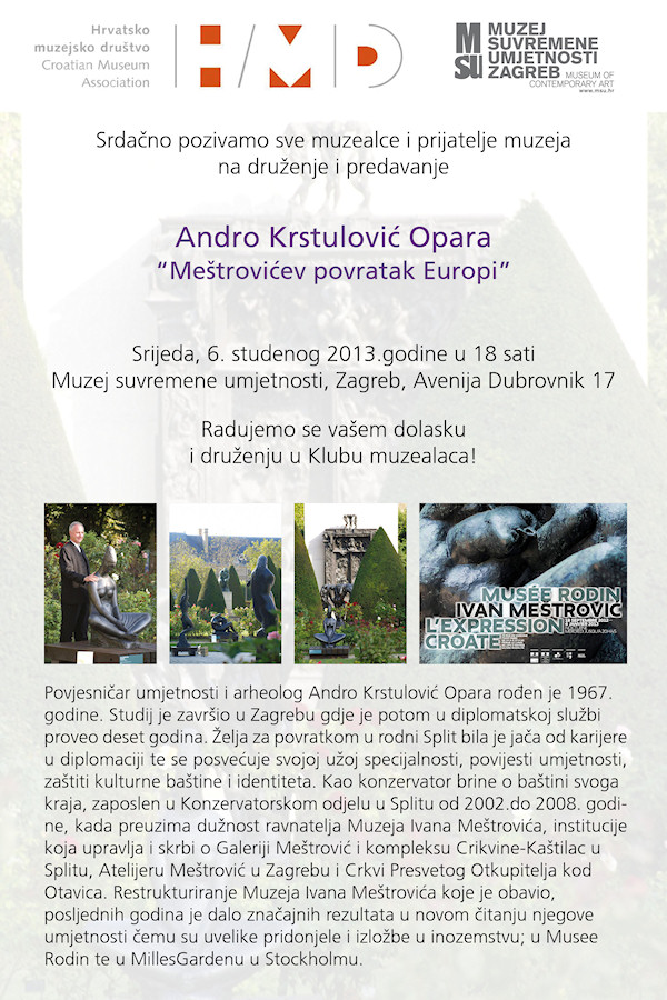 Pozivamo sve muzealce i prijatelje muzeja na druženje i predavanje Andra Krstulovića Opare, povjesničara umjetnosti i arheologa te ravnatelja Muzeja Ivana Meštrovića: Meštrovićev povratak Europi u Muzej suvremene umjetnosti u Zagrebu, u srijedu 6. studenog 2013. u 18 sati.